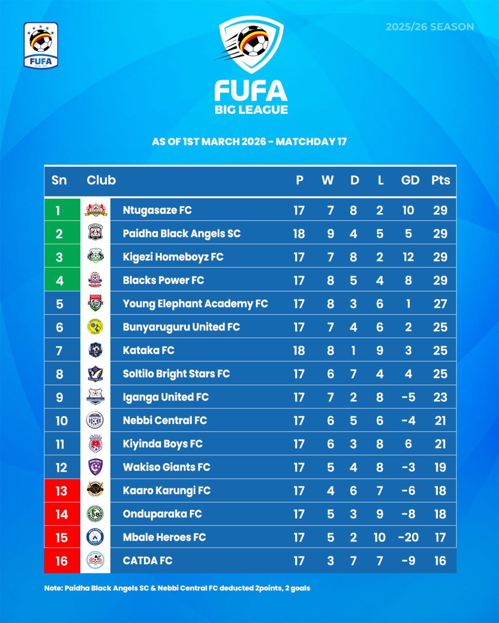 Paidha Black Angels now move jointly tied at the top on 29 points with Ntungasaze, Kigezi Homeboyz and Blacks Power; all split on Head to Head, as Nebbi Central moved a position higher; now placed tenth. Onduparaka's draw however pushed the club a step lower; moving to the fourteenth position.